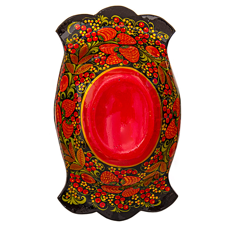 Форма выточена из массива березы цельный кусок. Поверхность декорирована в хохломской технике золочения. Роспись выполнена масляными красками, узор нанесен профессионально и четко. Лаковое покрытие в 8 слоев. Качественный пищевой лак без запаха, не взаимодействует с другими продуктами.