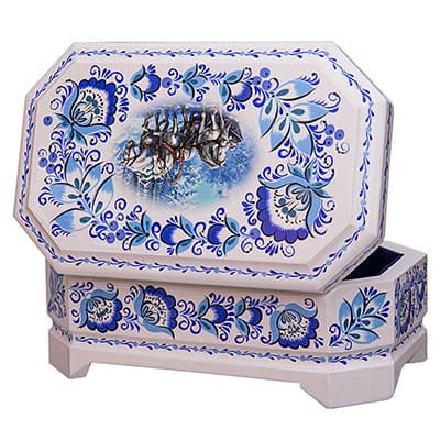 Оригинальный дизайн - белый фон и хохломские синие цветы, органичное сочетание хохломского узора и гжельской цветовой гаммы. Внутри шкатулка отделана синим велюром, в тон росписи. Поверхность покрыта лаком.