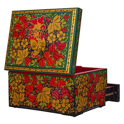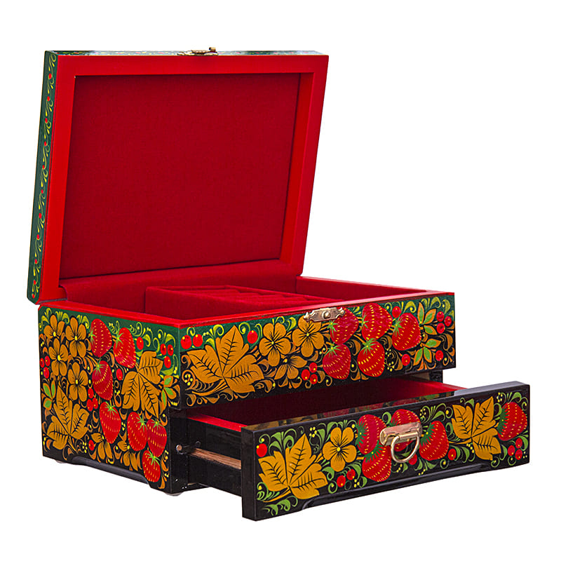 Красочная шкатулка в русском стиле. Шкатулка отлично подходит для хранения украшений и денег. Шкатулка комод с двумя ящичками.
