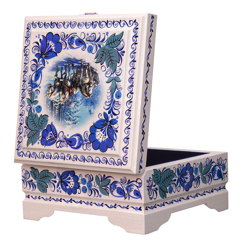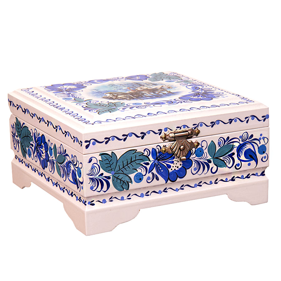 Оригинальный дизайн - белый фон и хохломские синие цветы, органичное сочетание хохломского узора и гжельской цветовой гаммы. Внутри шкатулка отделана синим велюром, в тон росписи. Поверхность покрыта лаком.