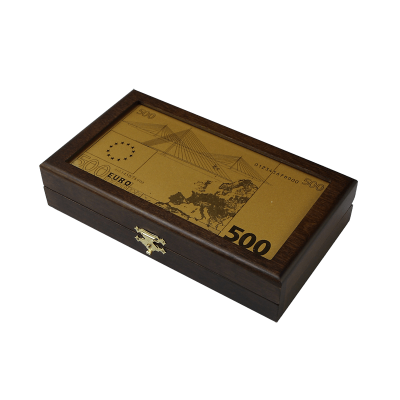 Корпус из массива дерева, поверхность полированная. На крышке стилизованное изображение банкноты 500 евро в золотистом цвете.