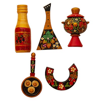 Комплект понравится тем, кто коллекционирует хохлому. В наборе 5 магнитов магнит подкова 6,5 х 5 см, магнит самовар 7 х 5 см, бутылка 9 х 3 см, балалайка 9 х 5 см, сковорода 9 х 4 см.