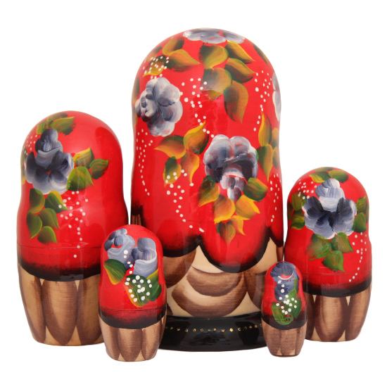Матрешка расписана вручную. На матрешках изображены разные эпизоды из сказки “Гуси лебеди”, на первой изображены Иванушка и Аленушка за которыми охотятся гуси-лебеди, на второй - Иванушка который улетает с лебедем, на третьей сами зачарованные птицы, на четвертой избушка Бабы Яги, на пятой небо с облаками.