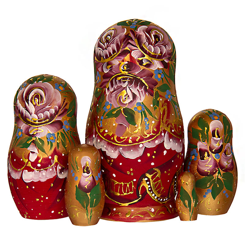 Матрешка расписана очень четко и аккуратно. Отлично прописаны лица, складочки на одежде. На голове каждой куколки яркий кокошник из золотой фольги.