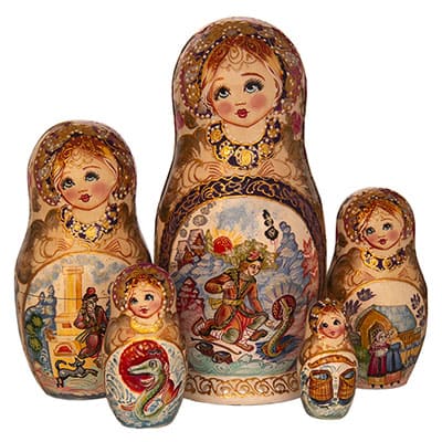 Стоимость матрешек По щучьему велению 5 штук с 40% скидкой 12360 рублей.