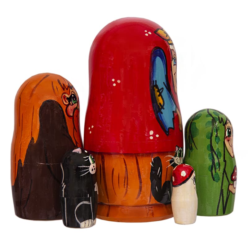 Матрешка Баба Яга в комплекте 5 персонажей. Первая игрушка - Баба Яга, затем идут леший, кикимора, черный кот и мухомор. Основа игрушек из дерева. Расписаны профессиональным художником, поверхность покрыта лаком.