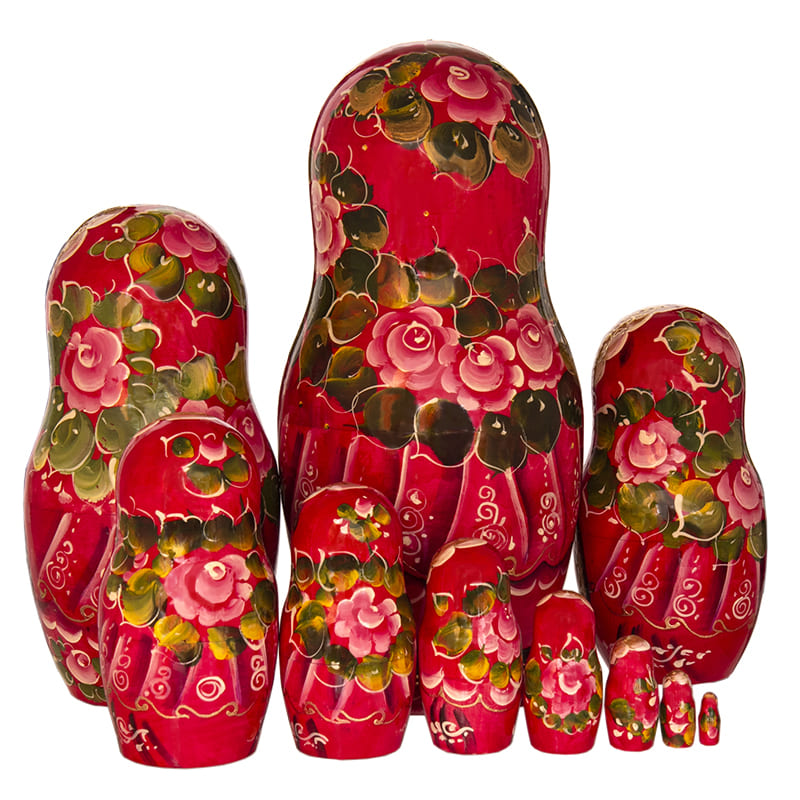 Все куколки выточены из массива березы, поверхность расписана вручную профессиональным художником. В каждой куколке создан образ девочки в русском народном костюме. В центре каждой иизображена стилизованная жанровая сцена в русском стиле.