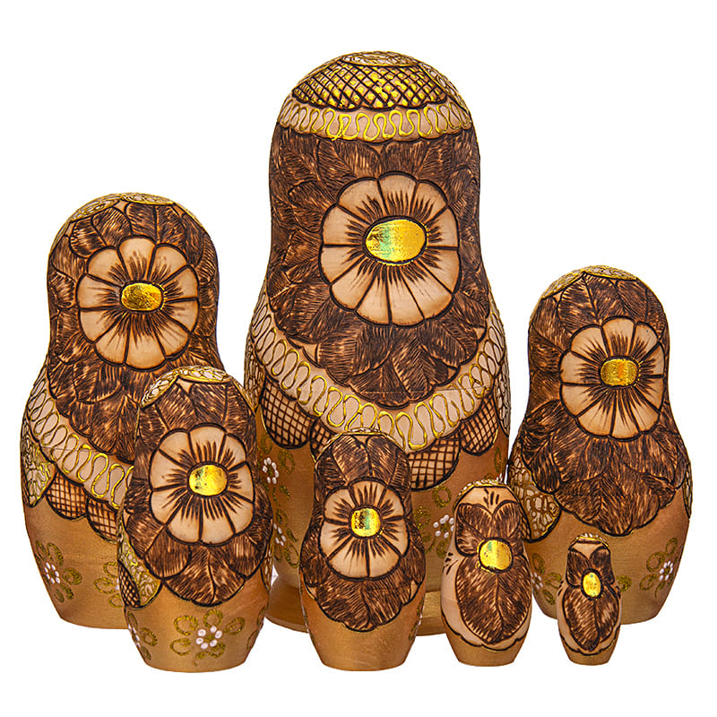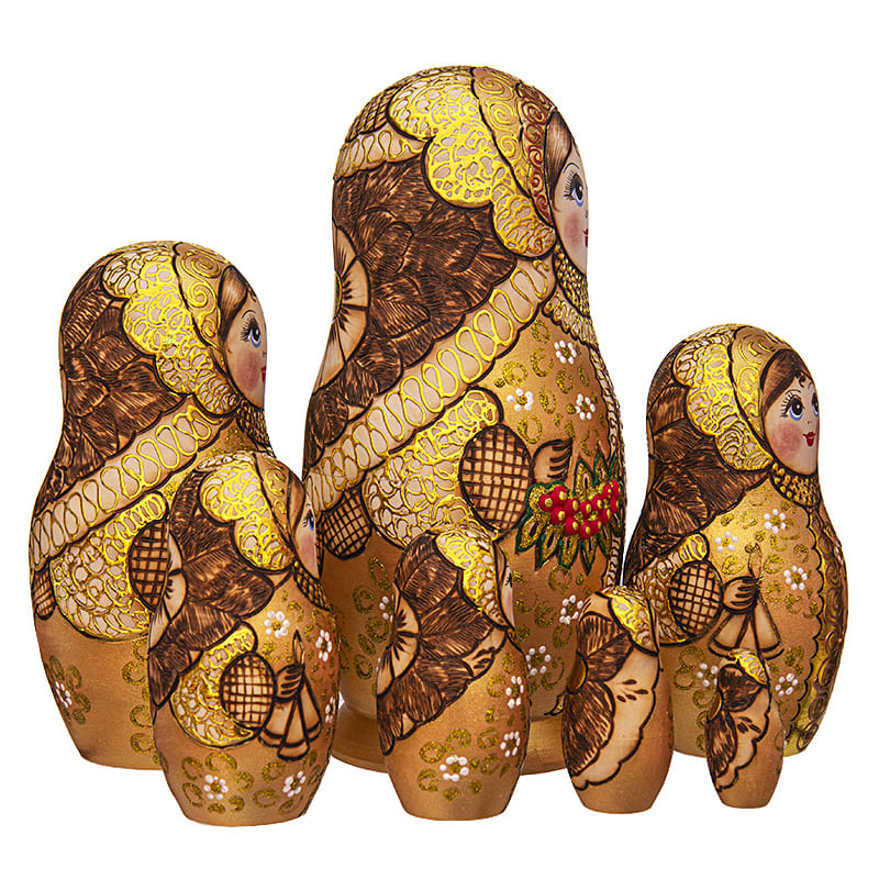 Матрешка расписана вручную и украшена узором созданным методом выжигания. Матрешки декорированы в ярких цветах. На головах золотые шали. Очень милые лица. Размер самой маленькой матрешки - 6 см. Хорошая, округлая форма, колоритный декор.