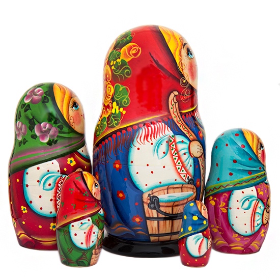 Хорошо и детально прописан узор. Матрешки изображены как девушки с разными предметами которые ассоциируются с русской народной культурой.