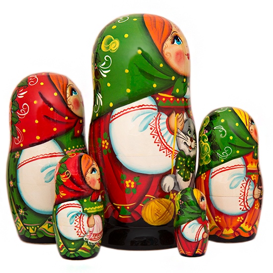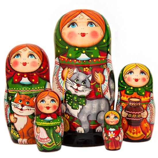 Основа сделана из массива липы, роспись выполнена профессиональным художником. Акцент сделан на свежем травянисто-зеленом оттенке, оранжевом, красном и контрастном белом. Все девочки одеты в русские народные костюмы, яркие сарафаны и аккуратные блузочки. На голове яркие платки. Первая девочка нарисована с большим серым котом. Вторая с рыжим котиком. Третья, четвертая и пятая - с кувшином, платочком, цветочком. На обороте первой матрешки - подпись художника и клеймо мастерской.