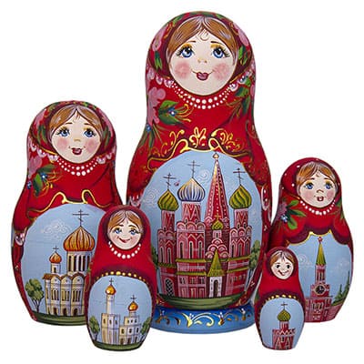Высокая коллекционная матрешка. Каждая кукла создана как нарядная красавица в цветастой шали и кокошнике. В центре каждого сарафанчика архитектурный памятник столицы, в комплекте представлены храмы, монастыри, златоглавые соборы.