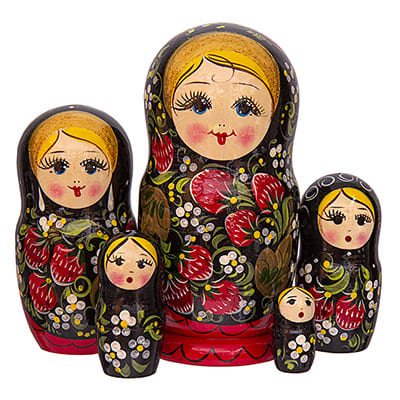 Матрешка расписана вручную. Матрешки декорированы в черном и красном цветах. На головах черные шали, в центре хохломской ягодный узор. Размер самой маленькой матрешки - 5 см. Хорошая, округлая форма, колоритная роспись.