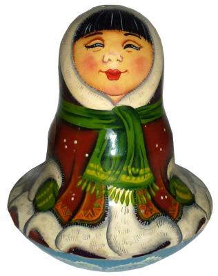 Форма сделана в виде колокольчика, роспись авторская. Неваляшка создана как девушка в шубке. Одет в традиционный якутский наряд. На обороте клеймо художественной мастерской.
