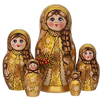 Матрешка расписана вручную и украшена узором созданным методом выжигания. Матрешки декорированы в ярких цветах. На головах золотые шали. Очень милые лица. Размер самой маленькой матрешки - 6 см. Хорошая, округлая форма, колоритный декор.