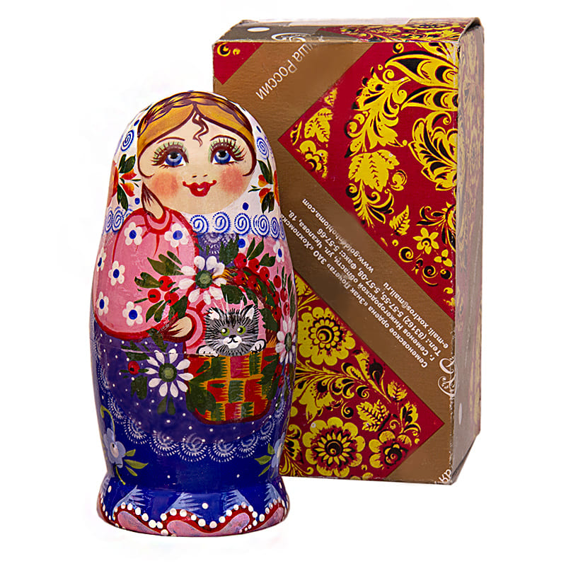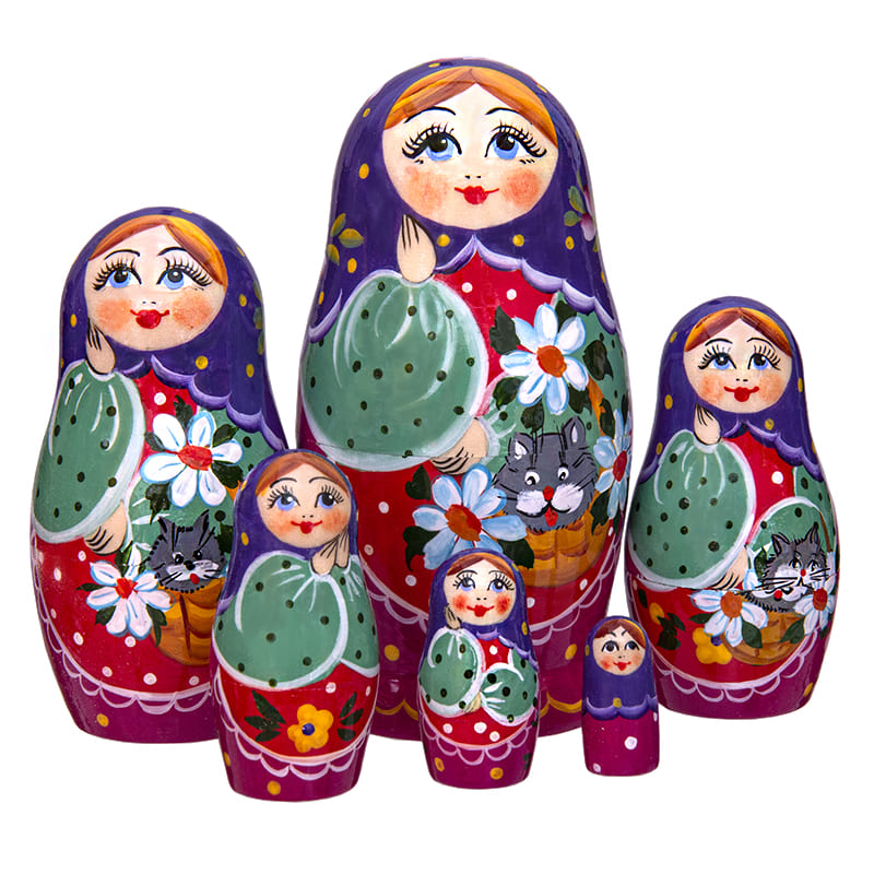 Хорошо и детально прописан узор. Матрешки изображены с котятами.