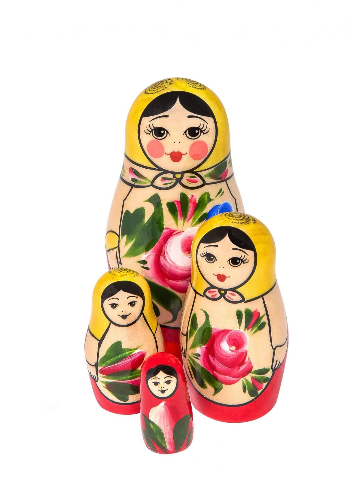 Набор из 4 куколки. Каждая форма выточена из дерева. Все матрешки созданы как настоящие русские красавицы. Роспись “семеновская”, ее характерные черты - сочетание желтого и красного цветов. В центре всегда рисуется букет роз. Этот тип росписи получил название от города Семёнов в Нижегородской области, где создаются эти матрешки.