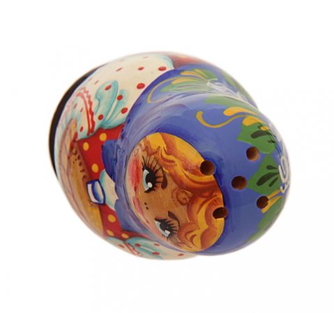 Сделана в форме матрешки, расписана профессионально - девочка в платке, в руках держит каравай. Солонка закрывается внизу пластмассовой пробкой, вверху есть отверстия.