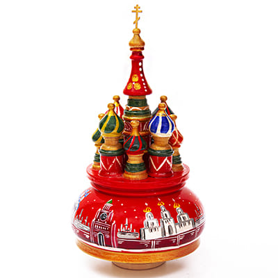 Великолепный подарок в русском стиле. Характерная черта - авторская роспись. Внутри помещен музыкальный механизм, который заводится с помощью диска на дне собора. При заводе, собор крутится вокруг своей оси, играет мелодия.