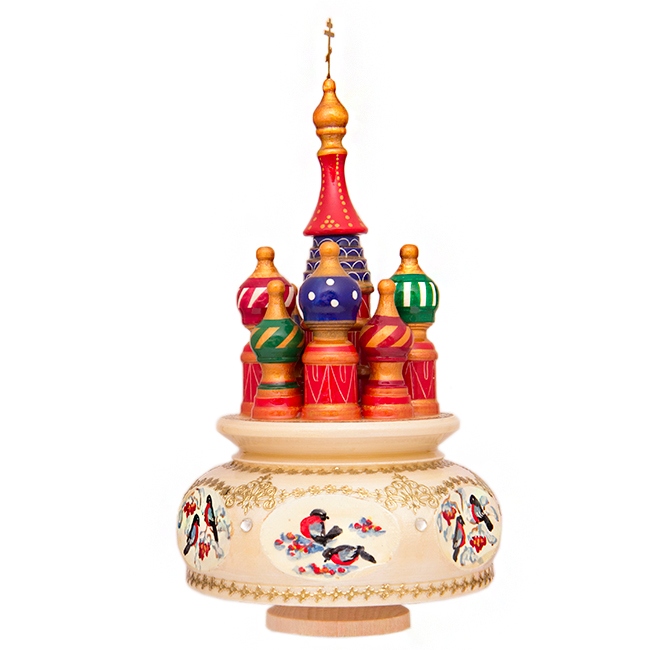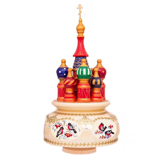 Роспись красочная, яркая - белый фон, по бокам красногрудые снегири - как символ настоящих русских морозов. При заводе механизма, собор крутится, играет приятная музыка.