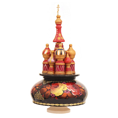 Музыкальная игрушка сделана в форме собора. Корпус деревянный, роспись выполнена вручную, поверхность покрыта лаком.