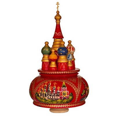 Великолепный подарок в русском стиле. Характерная черта - авторская роспись. Внутри помещен музыкальный механизм, который заводится с помощью диска на дне собора. При заводе, собор крутится вокруг своей оси, играет мелодия.