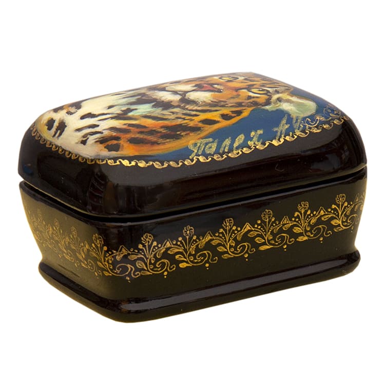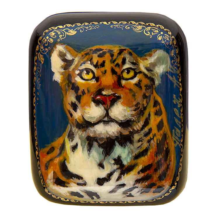 Эффектный портрет леопарда с внимательным взглядом. Миниатюра написана натуральными темперными красками на основе из папье-маше. По кругу орнамент написанный сусальным золотом.