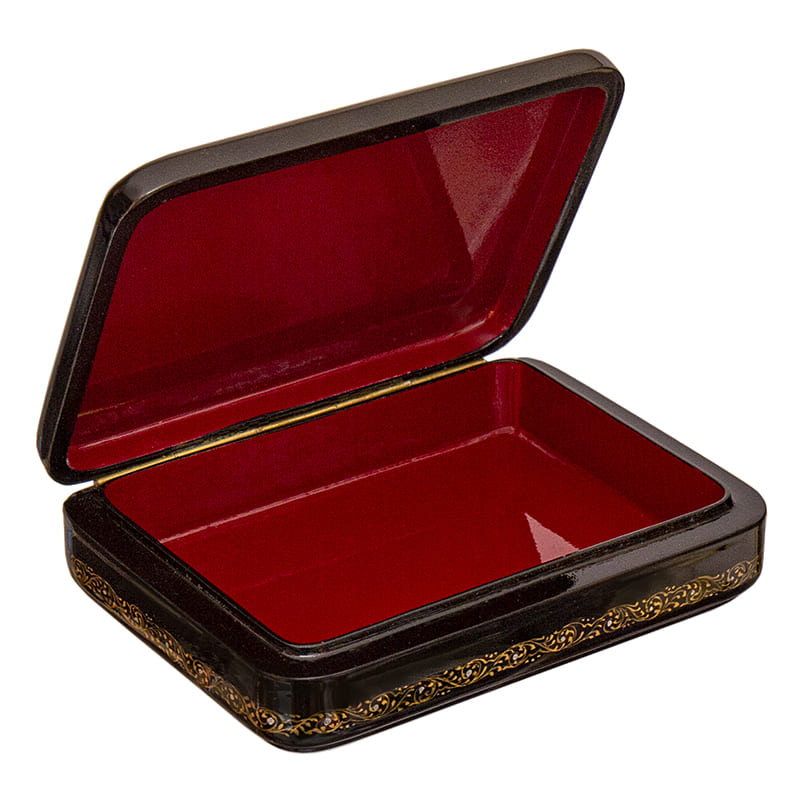 По бокам шкатулка декорирована узором, написанным от руки сусальным золотом.
