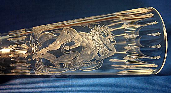 Рисунок нанесен методом ручной гравировки - старинная технология обработки стекла и хрусталя медными кругами. Рог украшен рельефным орнаментом.