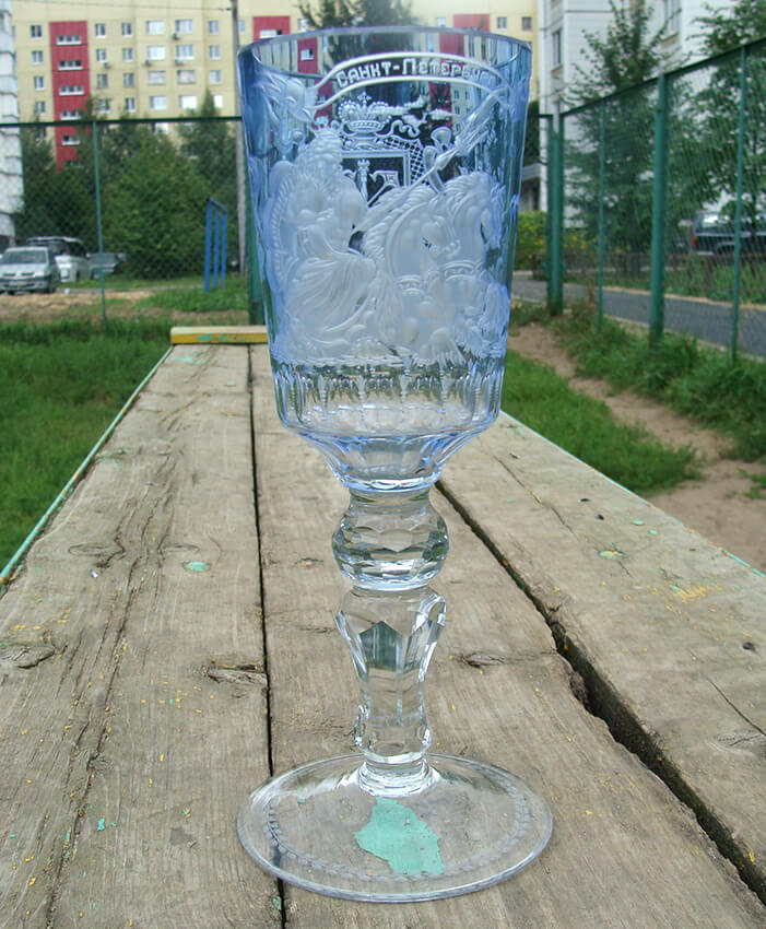 Рисунок нанесен методом ручной гравировки - старинная технология обработки стекла и хрусталя медными кругами. На поверхности выгравирован Нептун несущийся на гребне волны с трезубцем в руке. На другой стороне - герб Санкт-Петербурга.