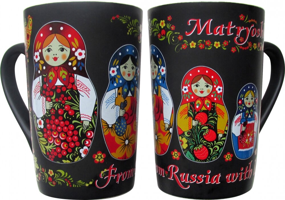 Стильная, современная кружка из фарфора. Основной фон - черный, на поверхности изображены разные матрешки в ряд. Вверху цветочный узор и надписи по-английски “Матрешки”. Рисунок очень колоритный, богатый, со множеством декоративных элементов, его интересно рассматривать.