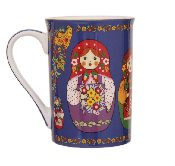 Стильная, современная кружка из фарфора. Основной фон - синий, на поверхности изображены разные матрешки выстроенные по росту. Матрешки одеты в русские народные костюмы, вверху узор стилизованный под хохлому и надпись по-английски "Matryoshka".