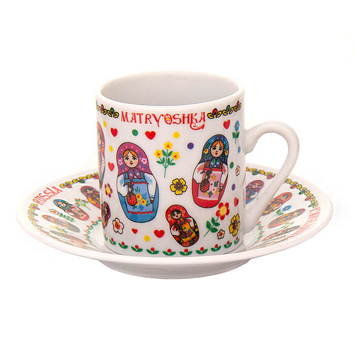 Миниатюрная чайная пара с изображением матрешек. В комплекте изящная чашечка и маленькое блюдечко. Комплект можно использовать как кофейный.