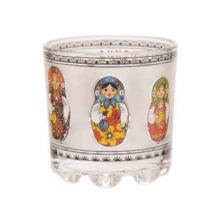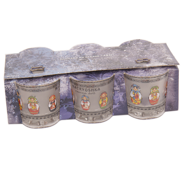 Красочный набор стопок для водки. Каждая сделана из массивного стекла, толщина стенок 1,5 мм. На каждой стопке изображены цветные матрешки в разных оттенках и вариациях. Все девочки в русских костюмах с платочками. На стопке надпись Matryoshka Russian doll что означает — Матрешка — русская кукла. По краю внизу и сверху идет изящный орнамент. Поверхность стопок матированная. На донышке — маленькие ножки.