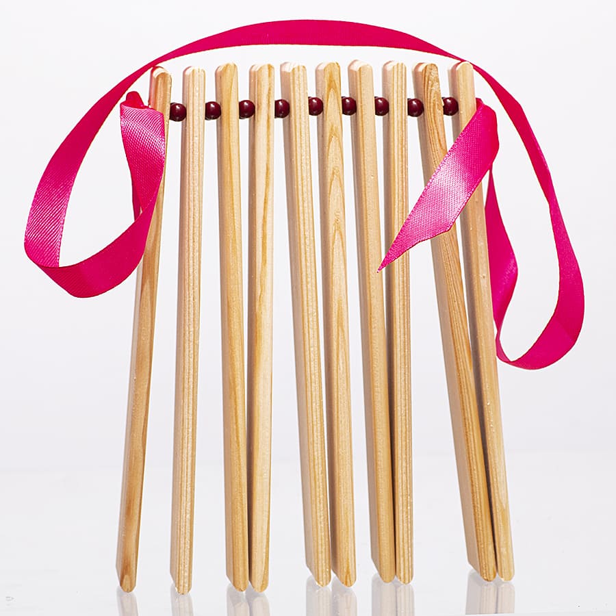 Пластины сделаны из сосны. Перемежаются с бусинками. Трещотка издает резкие, громкие звуки. За ленту удобно держать, можно повесить музыкальный инструмент на руку.