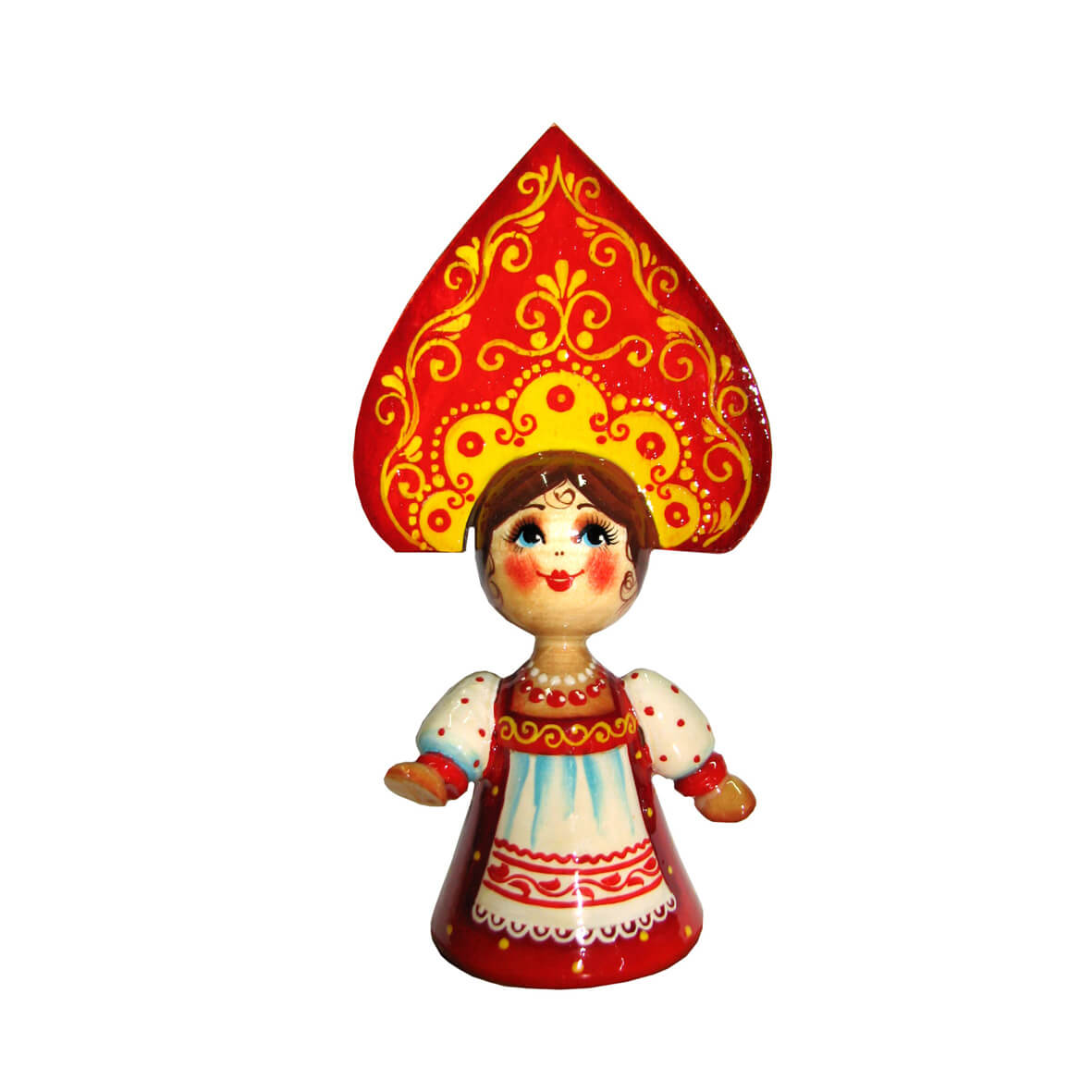 Фигурка сделана как маленькая девушка в русском народном костюме. На голове большой кокошник с расписным узором. Платье красного цвета. Забавное, румяное лицо.