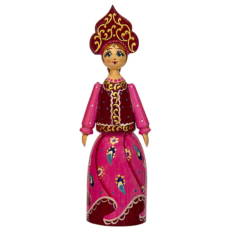 Коллекционная расписная кукла в русском стиле. На голове большой кокошник, одета в яркий сарафан. Тщательная роспись одежды, хорошо прорисована каждая деталь. Профессионально расписано лицо. Куклу можно подарить коллекционеру или ребенку.