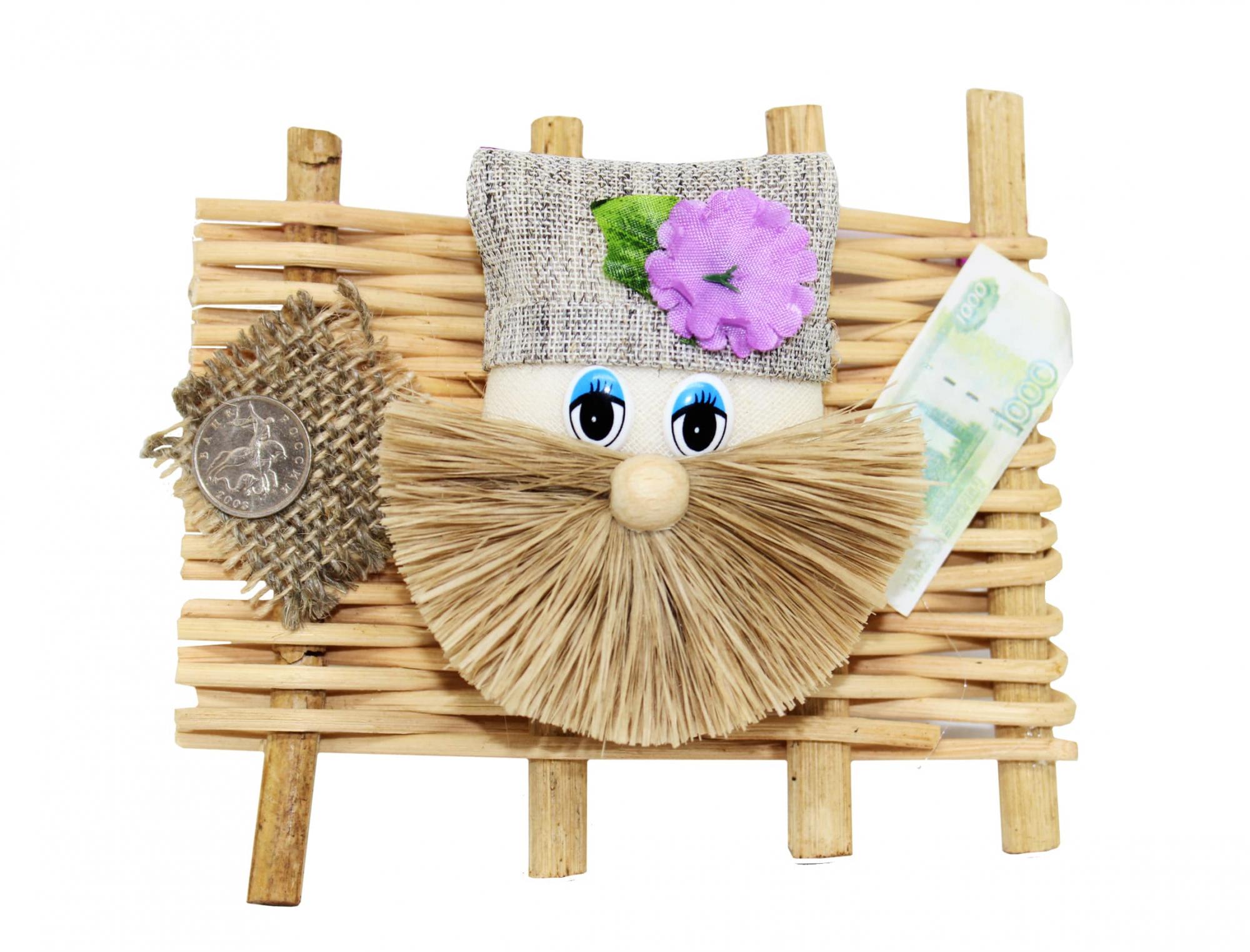 Голова домового помещена на забор, рядом монетка и купюра. На шапочке искусственный цветок - символ процветания. Забор - олицетворяет защиту от несчастий, финансовых неприятностей и долгов.