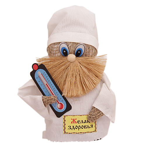 Текстильный домовой одет в халат и шапочку врача. В руках держит градусник и пожелание хорошего здоровья.