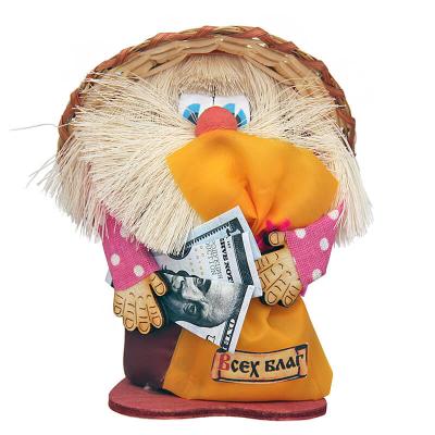 Маленький домовой посажен в соломенной шляпке. Лицо текстильное с длинной бородой и озорными глазами, в руках держит мешок денег и купюры. На мешке пожелание.