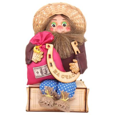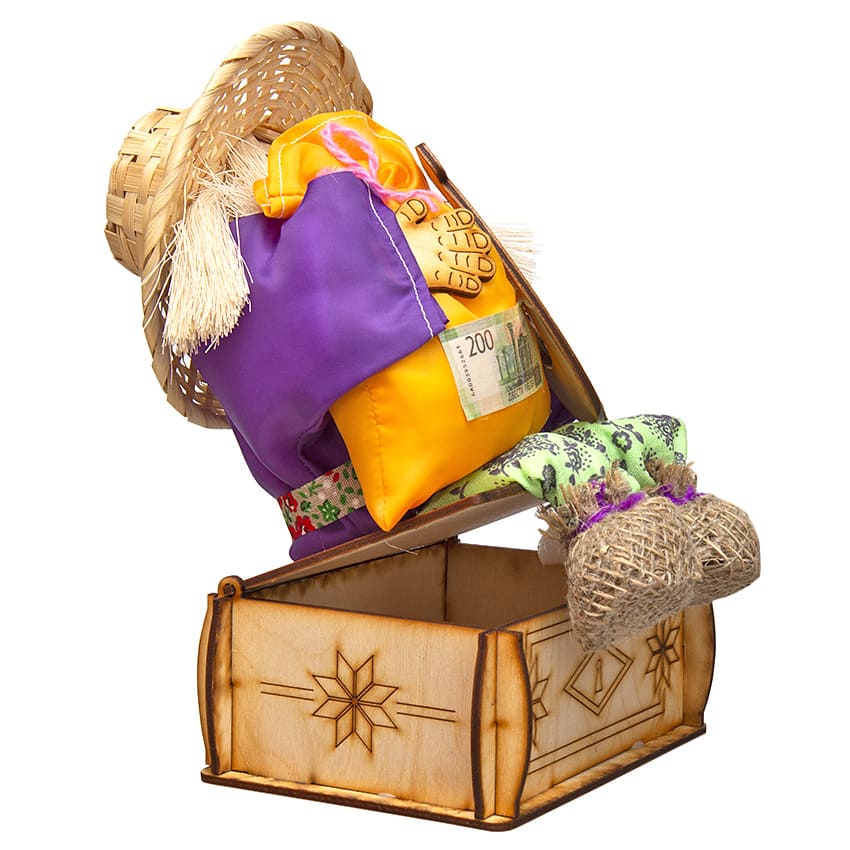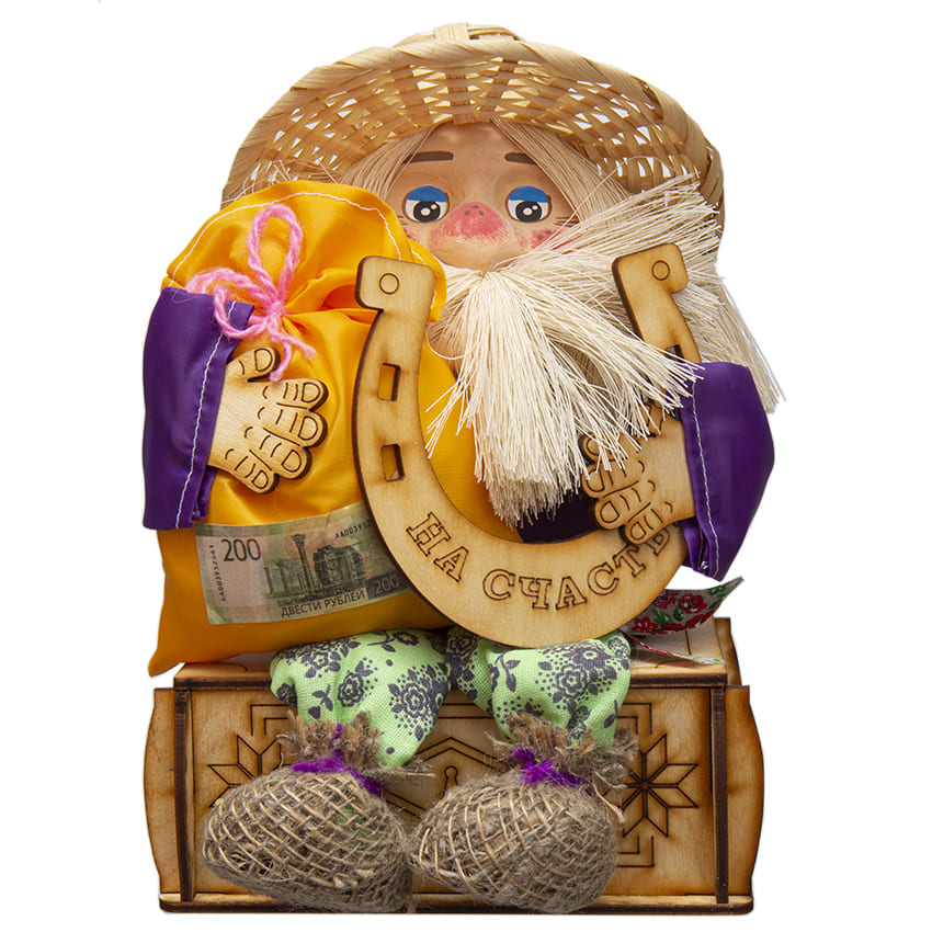 Домовой Денежный с подковой - ваш хранитель и хозяин дома. Лицо из гипса, раскрашенное акварельными красками. Сшит из текстиля, одет в русский народный костюм - рубаху, штаны, на ногах лапти. На голове - соломенная шляпа. Домовой сидит на шкатулке.