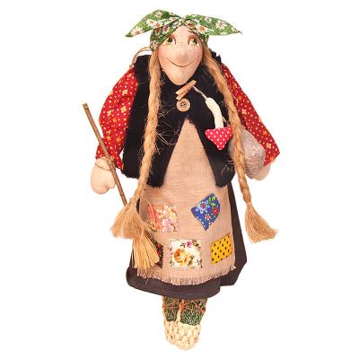 Авторская баба яга. Сшита из натуральных тканей - хлопка, ситца, льняной рогожки. В руках держит помело. Улыбчивое, доброе лицо.