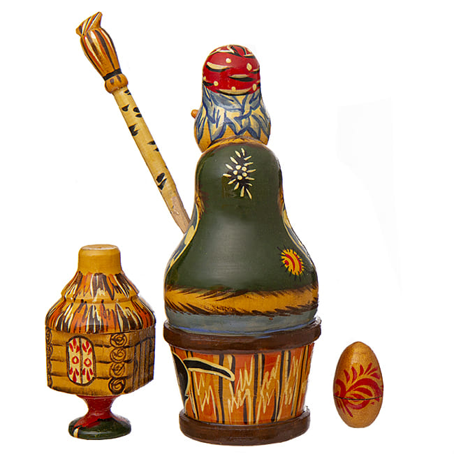 Маленькая, деревянная Баба Яга с помелом. Можно подарить как интересную игрушку для ребенка или использовать в качестве домашнего оберега. Внутри еще 2 куклы - избушка и яйцо с иглой Кощея. Складывается как матрешка.