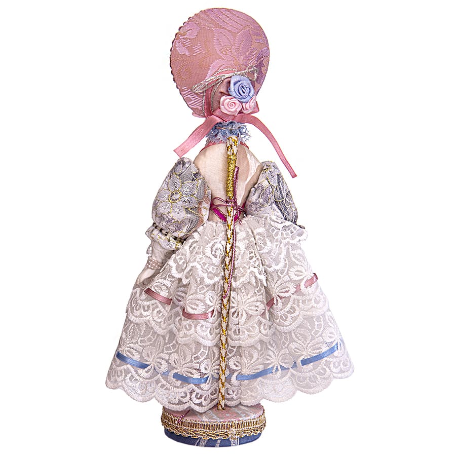 Кукла стоит на подставке, ручки, ножки и голова сделаны из бисквита - неглазурованного фарфора. Лицо расписано акварелью. Костюм сшит как наряд горожанки дворянки из Санкт-Петербурга. Девушкаа одета в парчовый капор, платье из кружев с отделкой из атласных ленточек и роз. Атласный корсет дополнен бусиками.