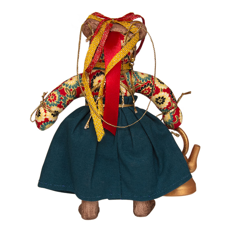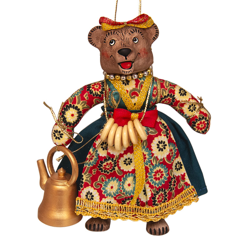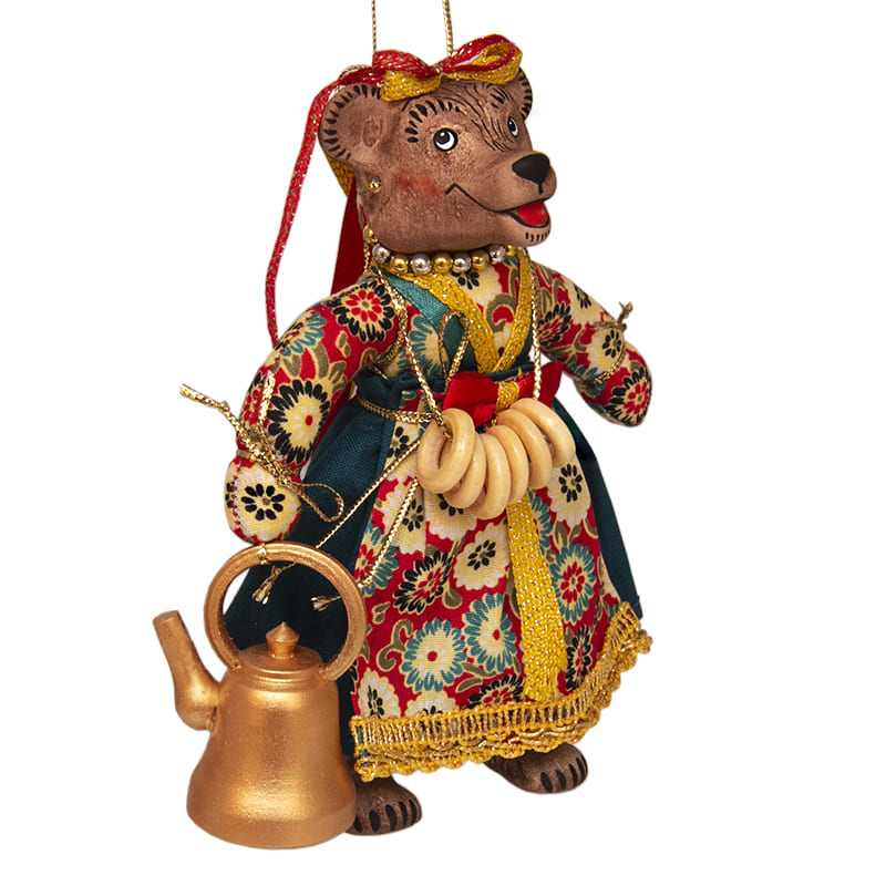 Основа сделана из неглазурованного раскрашено фарфора. Внутри медведь мягконабивной, но очень плотный. Одета в традиционный русский наряд сшитый из пестрого ситца. Мордочка медведя раскрашена акварельными красками. Лапки тоже фарфоровые. В лапе держит чайник, на шее нитка с баранками..