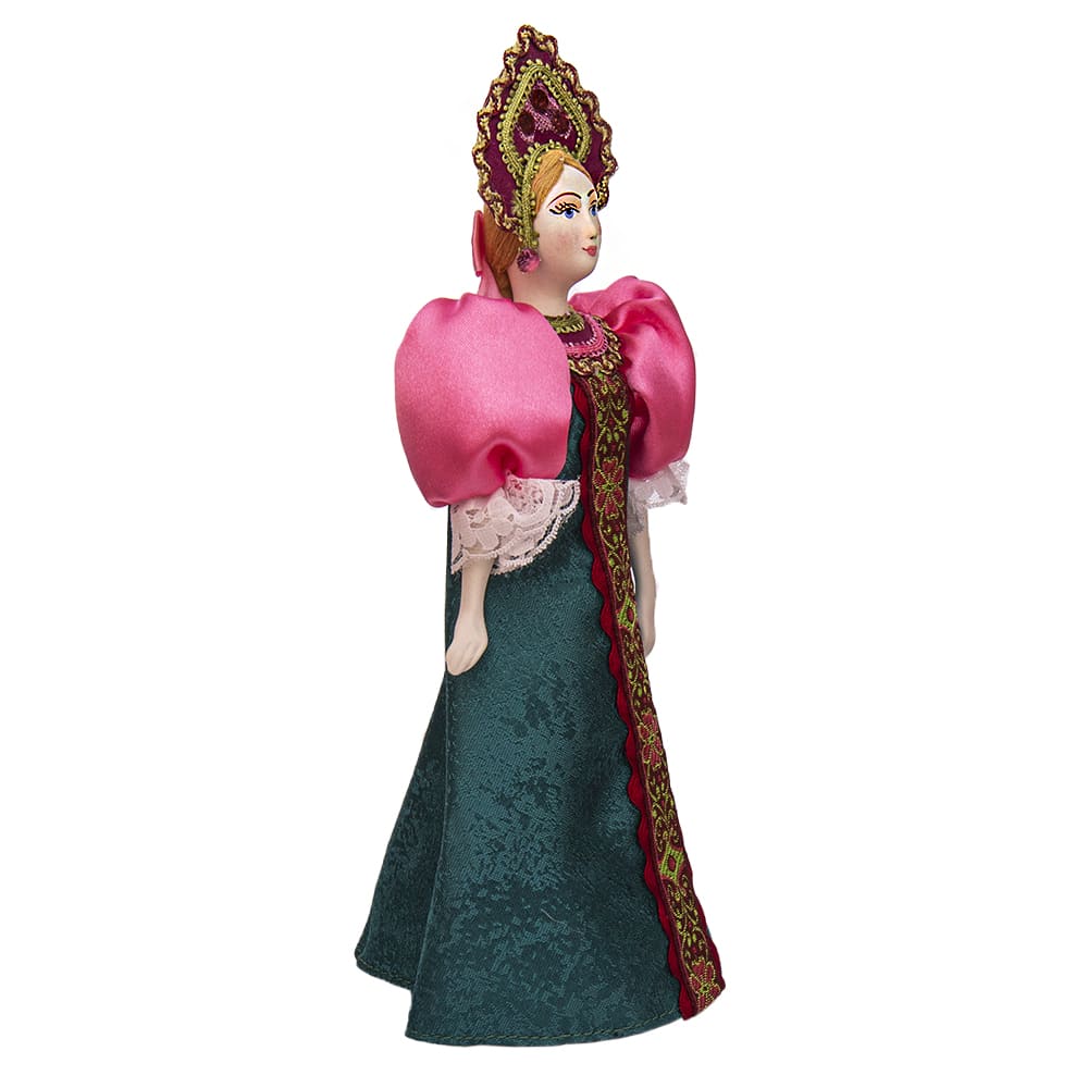 Кукла сделана в ограниченном количестве. Одета в традиционный русский костюм - зеленый сарафан с широкой золотой тесьмой, розовую блузу. На голове роскошный кокошник. Волосы заплетены в косу. Это традиционный женский костюм 19 века.