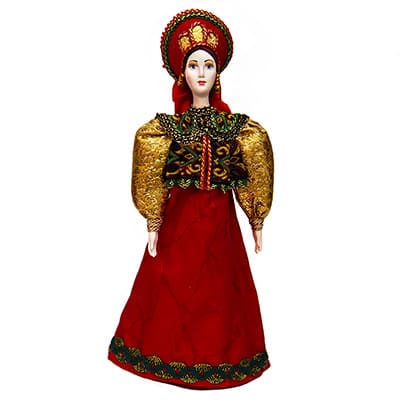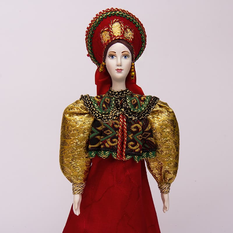 Красивая, яркая кукла. Основа сделана из фарфора в форме конуса. Кукла одета в традиционный русский костюм 18 века. Девушка одета в красную атласную юбку отороченную тесьмой, красивый жилет с вышивкой, золотая блуза с узором. На голове красивый кокошник, позади коса с атласным бантом. Дорогие ткани наряда и яркость отражают высокий социальный уровень персонажа.