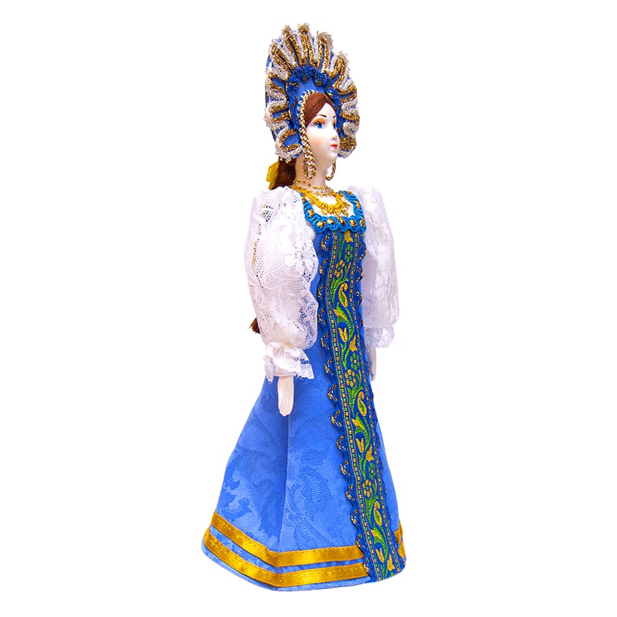 Основа - подставка, лицо, ноги и руки сделаны из неглазурованного раскрашенного фарфора. Кукла авторская, яркая. Настоящая русская красавица. Сарафан сшит из атласной ткани с аккуратными строчками, белая кружевная блуза. На голове красивый кокошник отделанный золотой тесьмой.