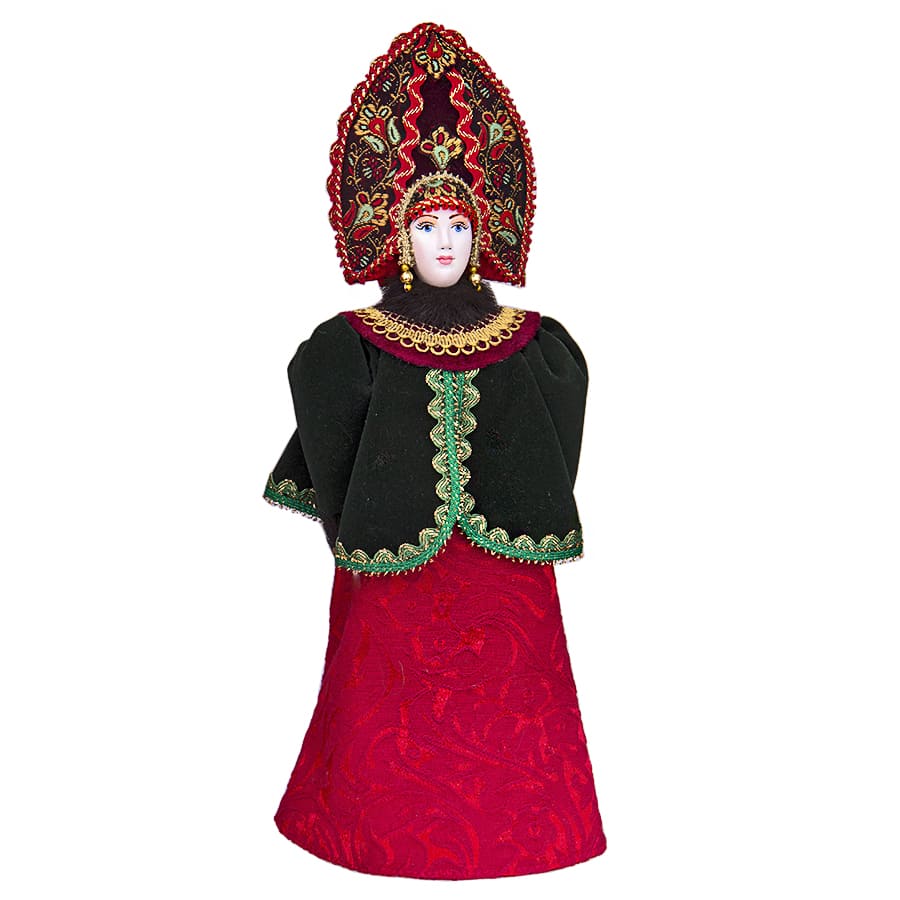 Основа сделана в форме фарфорового конуса, голова и ручки из фарфора. Кукла одета в традиционный боярский наряд 19 века. Красная юбка с узором, бархатная душегрея с меховым воротником под норку и золотой сеткой, на голове кокошник расшитый золотой тесьмой. Обозначена изящная талия.