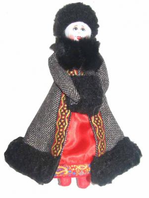 Кукла Горожанка одета в женский зимний костюм. На девушке пальто отделанное искусственным мехом и яркой тесьмой. Лицо рисованное, на голове зимняя шапочка.