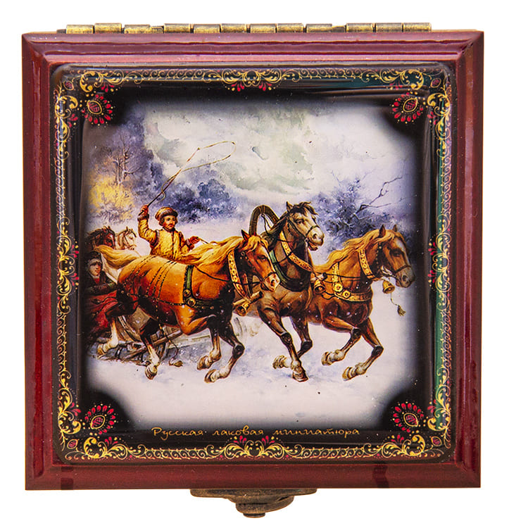 Великолепный подарок для любителей зимних праздников. Характерная черта - традиционный сюжет, на крышке помещено контрастное изображение зимней тройки. Внутри шкатулка отделана красным велюром.